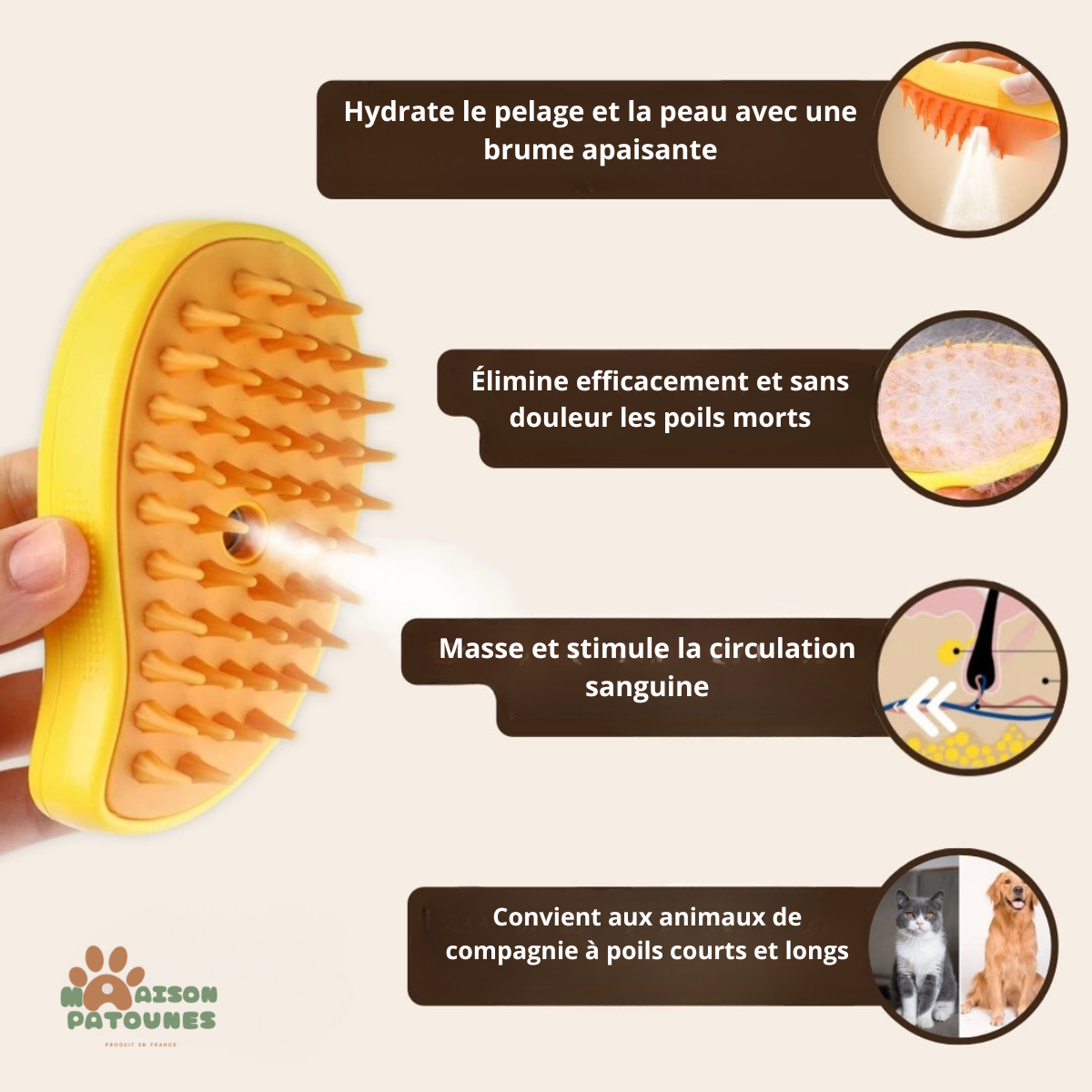 Non, la brume est sûre pour votre animal. La brosse diffuse une brume très fine et froide, qui hydrate efficacement sans utiliser de chaleur, rendant son utilisation confortable et sûre pour le pelage de votre animal.